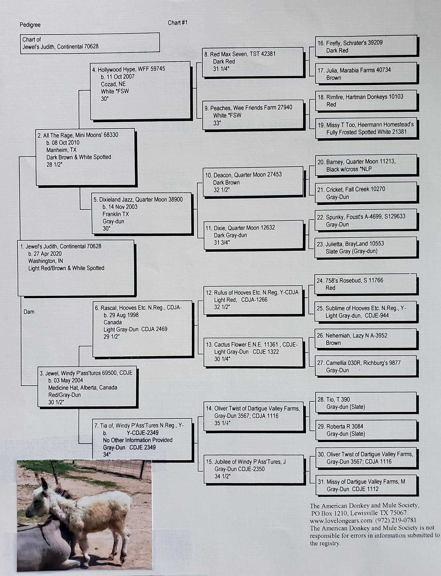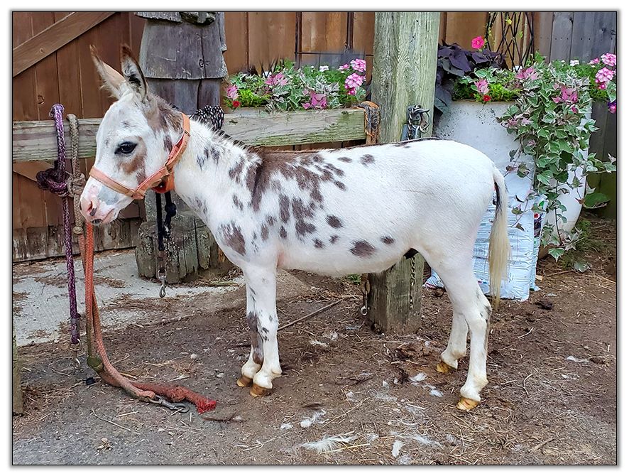 DIRECTIONS FOR PRODUCING A SPECIAL MINIATURE DONKEY: Start with Mini Moons All The Rage, a son of Quarter Moon Dixieland Jazz, and breed him with Windy P'Ass'tures Jewel, a daughter of Hooves Etc. Rascal, and wait twelve months....and voila', out comes Continental Jewel's Judith. Judith has an impressive chest and a nice round rump that we breeders all love on our donkeys. You'll be proud to have Judith in your herd.