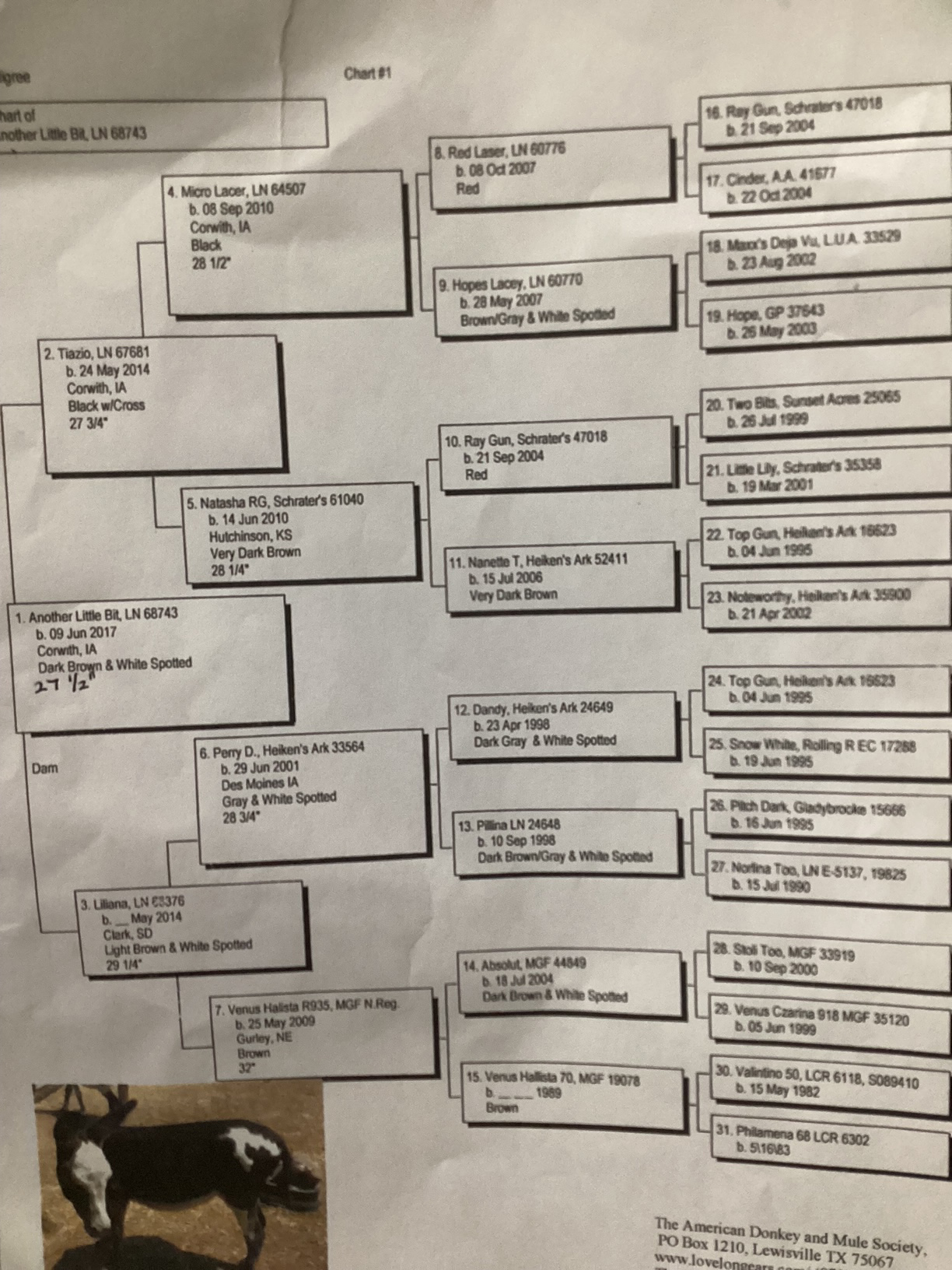 Click here to see the pedigree of LN Another Little Bit, the 27½" spotted sire of the spotted jack foal by her side.