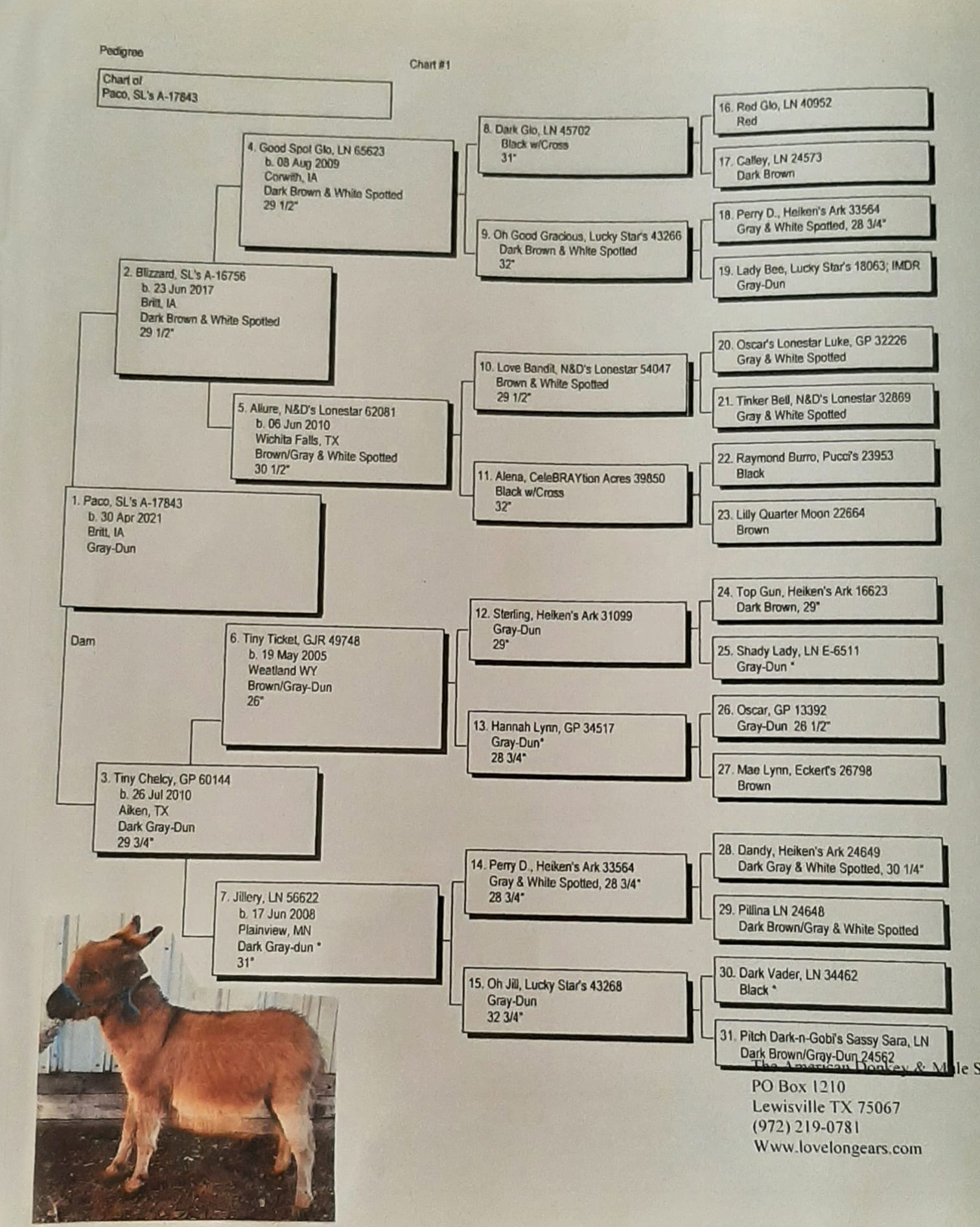 Click here to see the pedigree of LN Another Little Bit, the 27½" spotted sire of the spotted jack foal by her side.