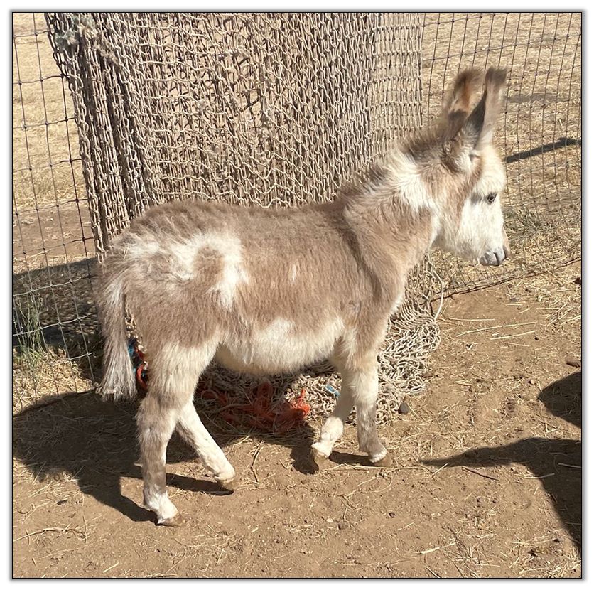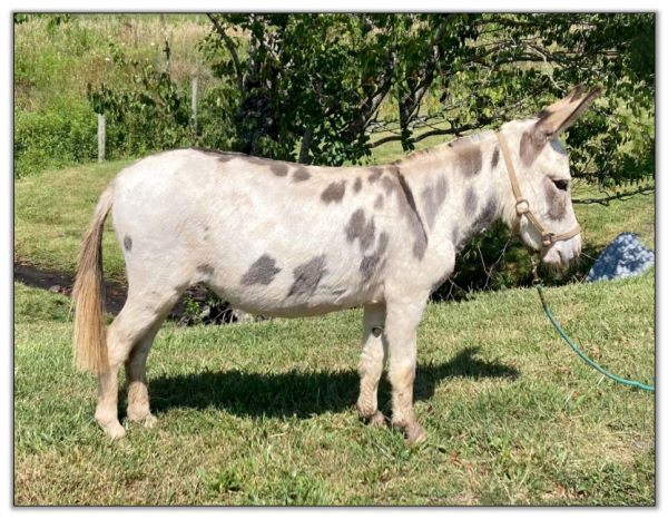 The 2nd of our Red jennies, Rose, offers a Red Roan color and it has clearly been passed down to her 2022 red-roan/white spotted jack foal. He is certainly considered as herd sire material. Rose is a very friendly, social jenny, and when crossed with a micro jack (like the sire of her 2022 foal), the size should be just what both micro and mini breeders desire.