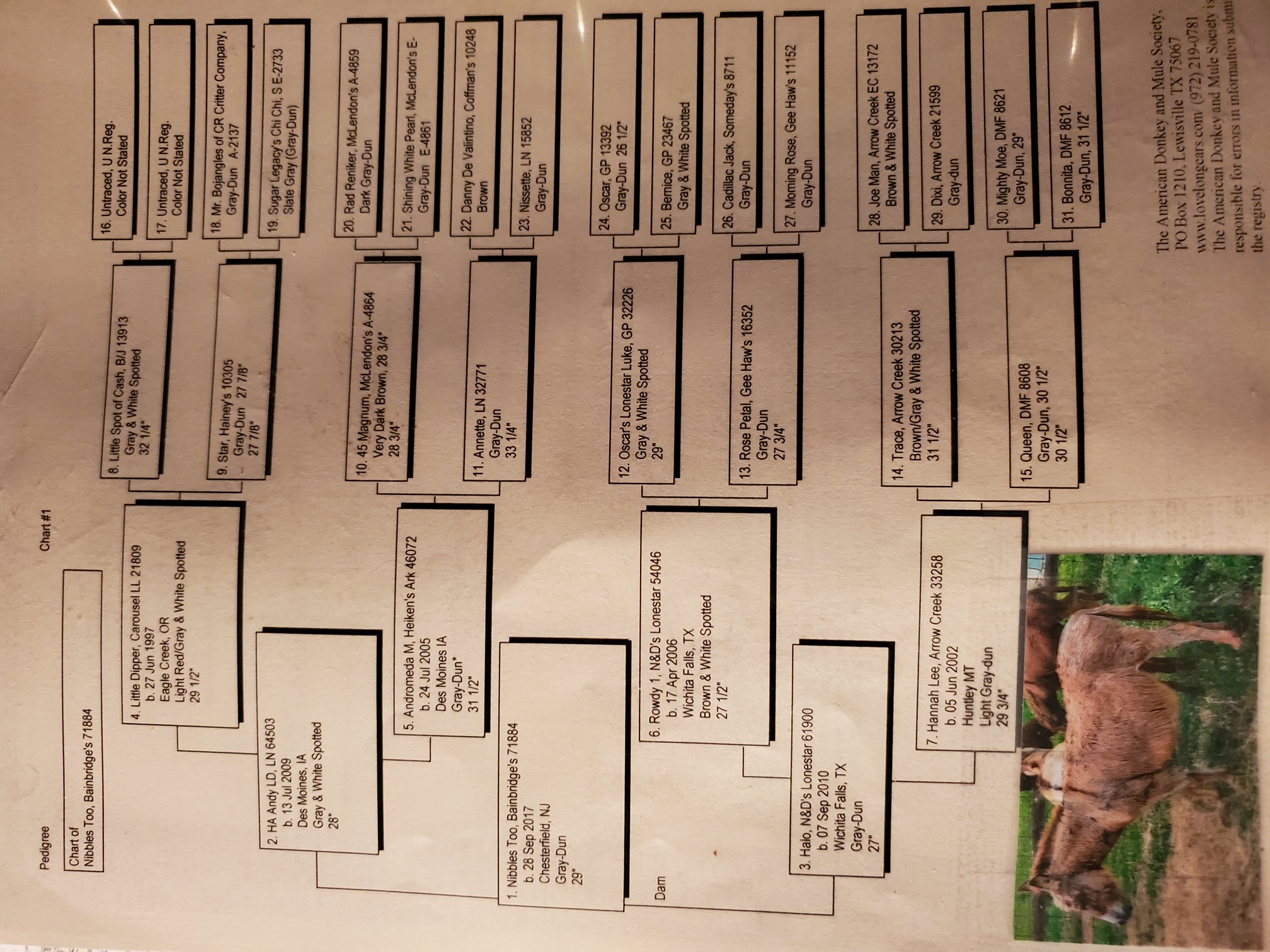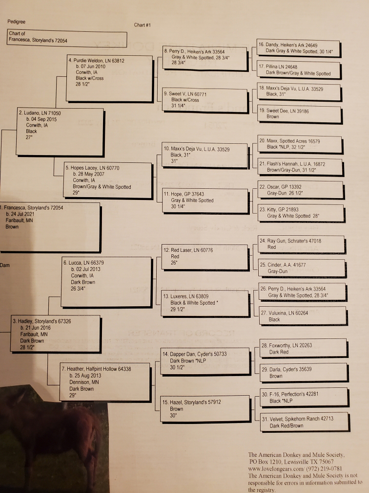 KNIGHTFALL is by LOW DOWN'S SUNDOWN, a 24¾" dark red/brown jack, who is by SUNSET ACRES JADEN , a 28½" a red & white spotted and out of DUPLESSIS FARMS KLEIN CHLOE, a 28" Gray-dun. KNIGHTFALL is out of the brown/gray and white spotted jennet SHORTVIEWS LUCY IN LACE, who stands at 27¾", and she is by LN MICRO LACER, a black 28½" jack, and out of HOLLYOAKS PAGE who is a 29¾" gray & white spotted jennet.