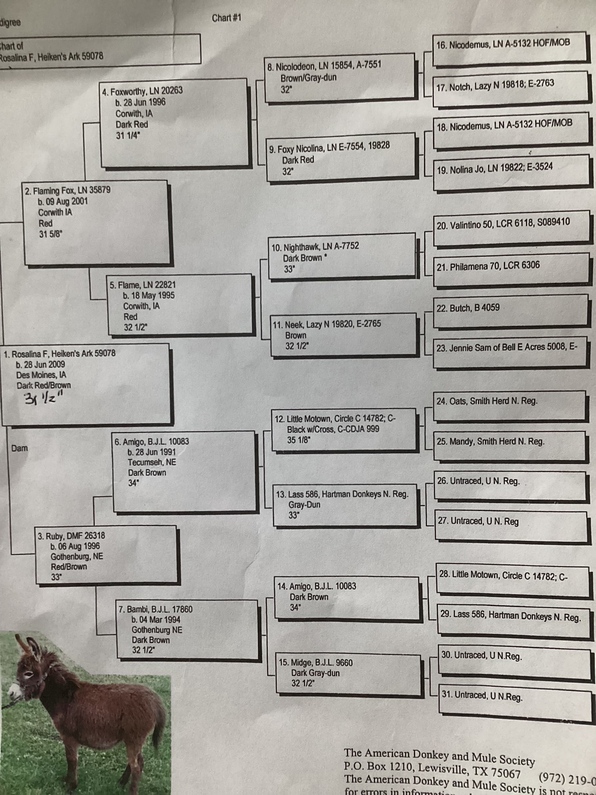 - An attractive Dark Red jenny, with highly sought after old bloodlines. She is confirmed in foal to our 27½" dark spot jack, LN Another Little Bit, for a December 2022 foal. Rosalina is currently an easy breeder & great mom. We have sold all her foals to date, so don't let the age fool you on this one. We are sure she will be a producer for a few more years to continue to pass on these old bloodlines. Vet letter verifying when confirmed in foal by ultrasound and due date.