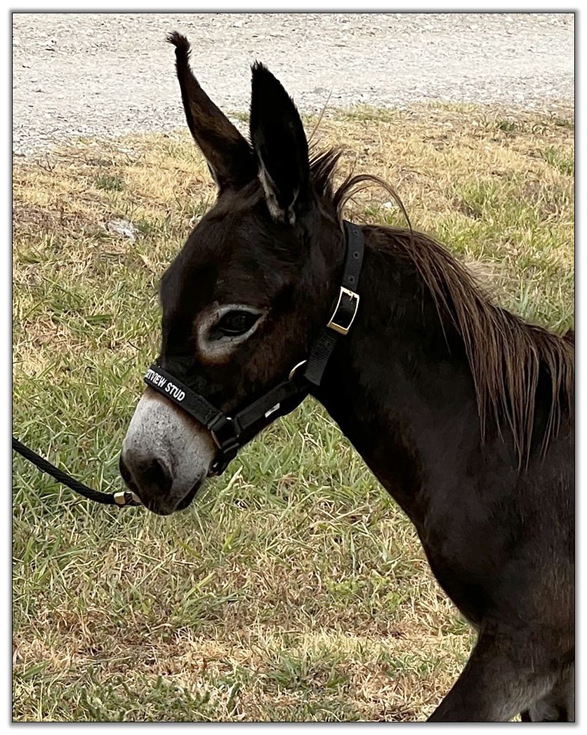SHORTVIEW'S GIACCALONI (pronounced jack-a-loni) is a March 31, 2021, black or very dark brown jack with a long layover mane and a long tail. We clipped him but left his mane and tail so you could see the hair. He has no visible cross. He is by LOW DOWNS SUNDOWN, a 24¾" dark red/brown hairy/wooly jack, who is by SUNSET ACRES JADEN, a 29¾", and out of DUPLESSIS FARMS KLEIN CHLOE. GIACCALONI is out of DONKETTE KORRALS MISS SHERI, a 29½" brown jennet by 29" LN PERCY NIC, and out of 31" HILLS HAVEN SHERI.